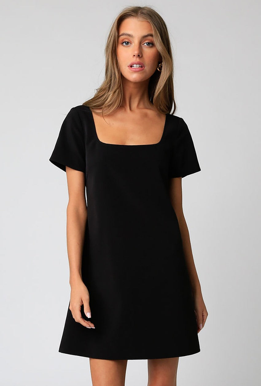 Our Denita Mini Dress features a square neckline and a open back with neckline button closure. This is the perfect throw on and go LBD.