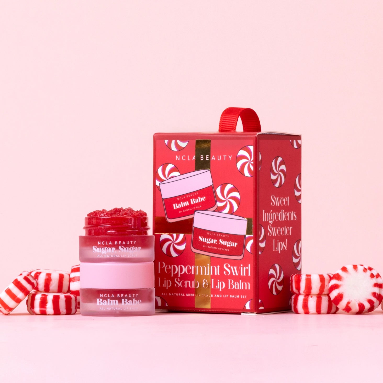 Spread the holiday cheer with this peppermint swirl ornament gift set! Complete with a 5 ml lip scrub and lip balm, this treatment set has everything for mistletoe kisses.