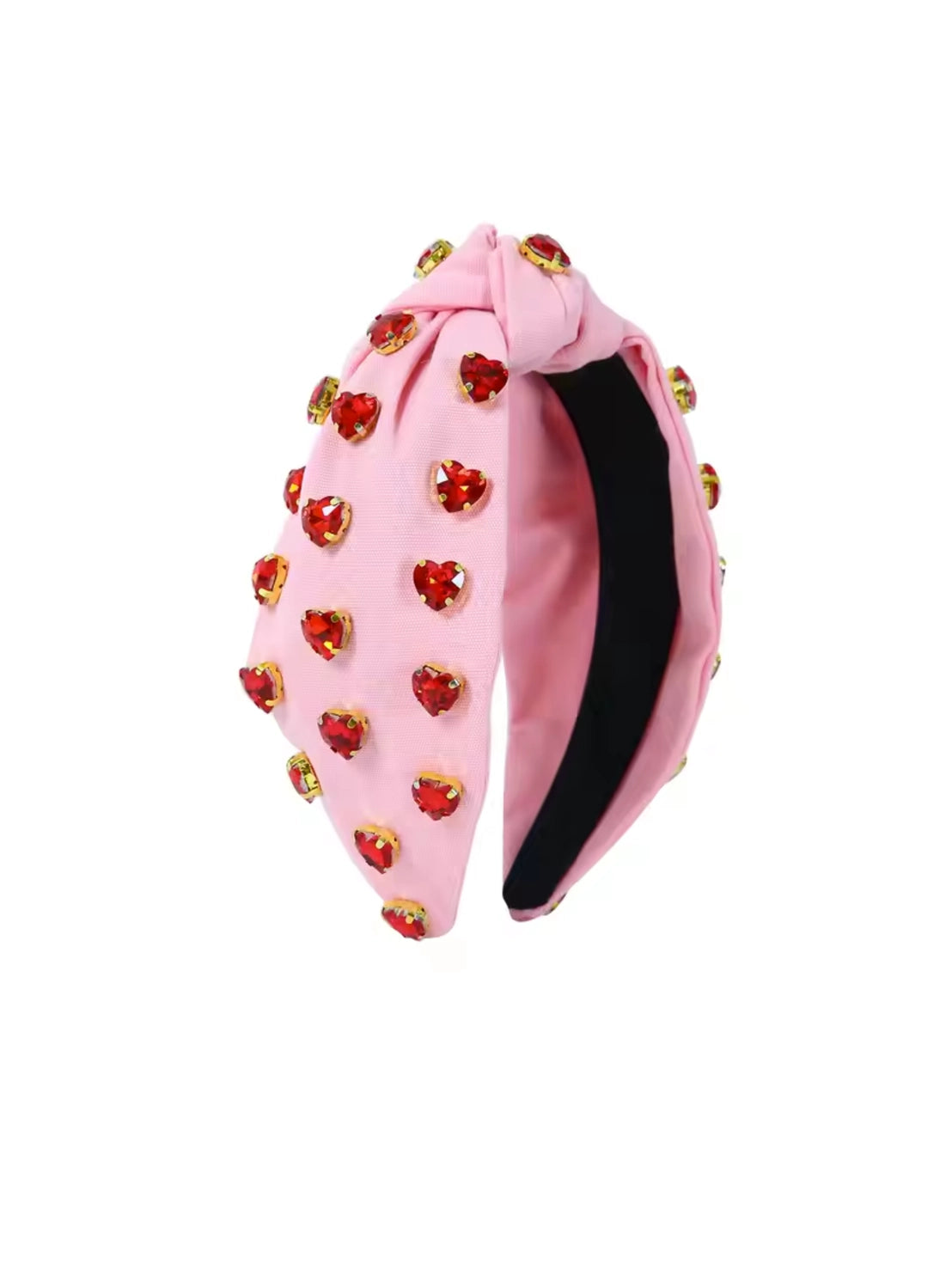 Pink top knot headbnd with red jewel hearts all over.