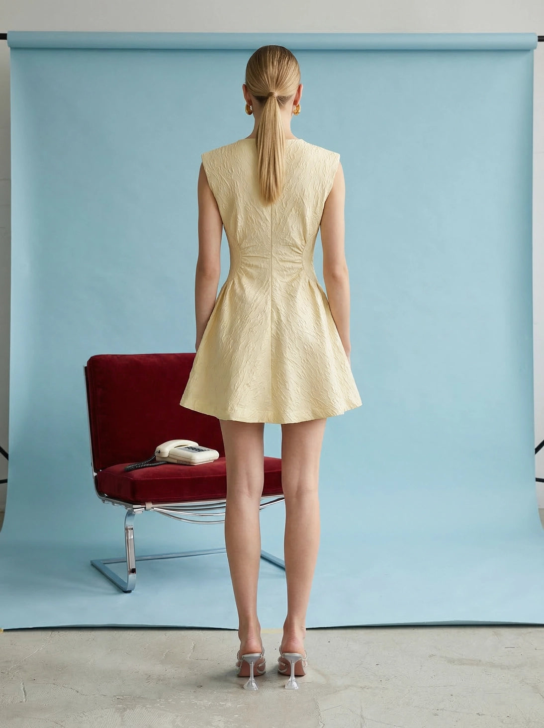 A beautifully textured sleeveless dress designed with a clean neckline and a softly structured A-line silhouette. The gathered waist detail enhances shape while keeping a refined and elegant look. Lightweight, polished, and easy to style! Perfect for special occasions or upscale boutique collections. A flattering fit that offers a timeless and feminine silhouette you'll love!